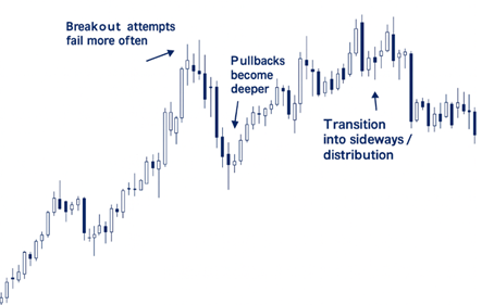 If the swing legs become smaller or pullbacks deepen, the trend is weakening.